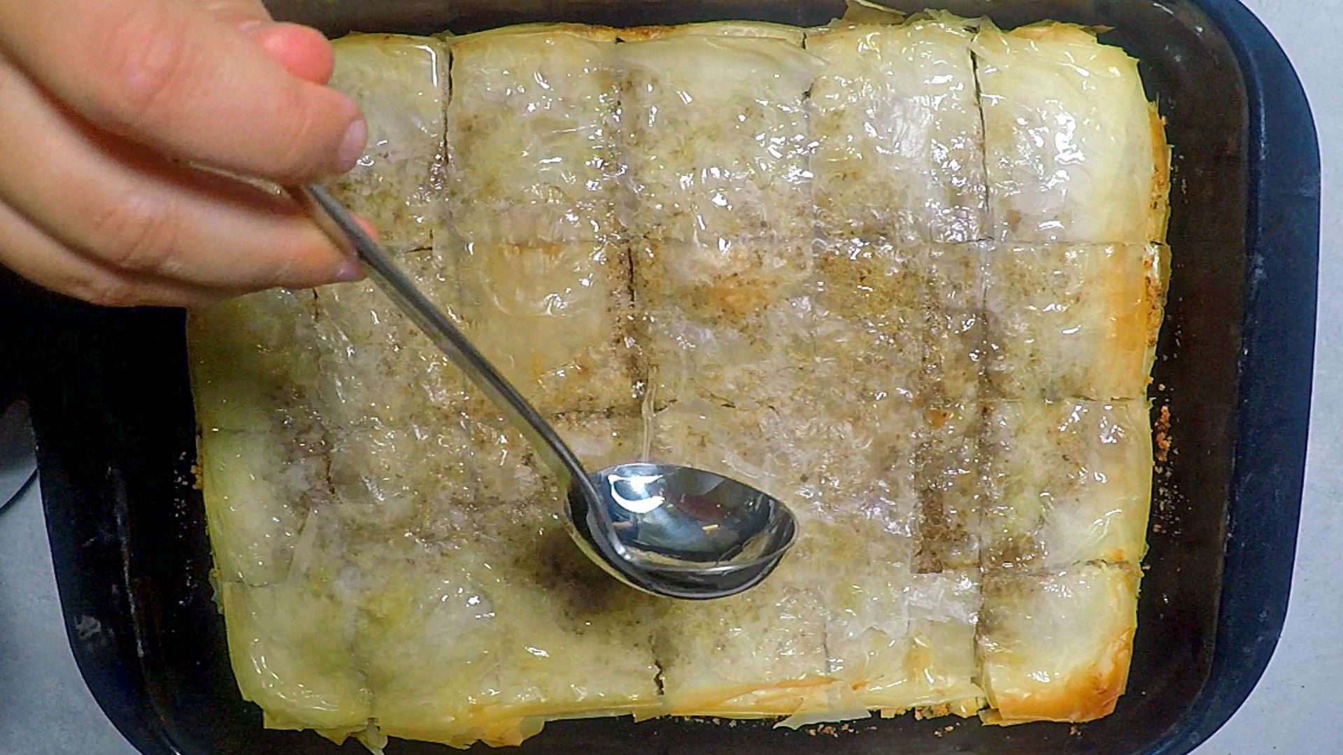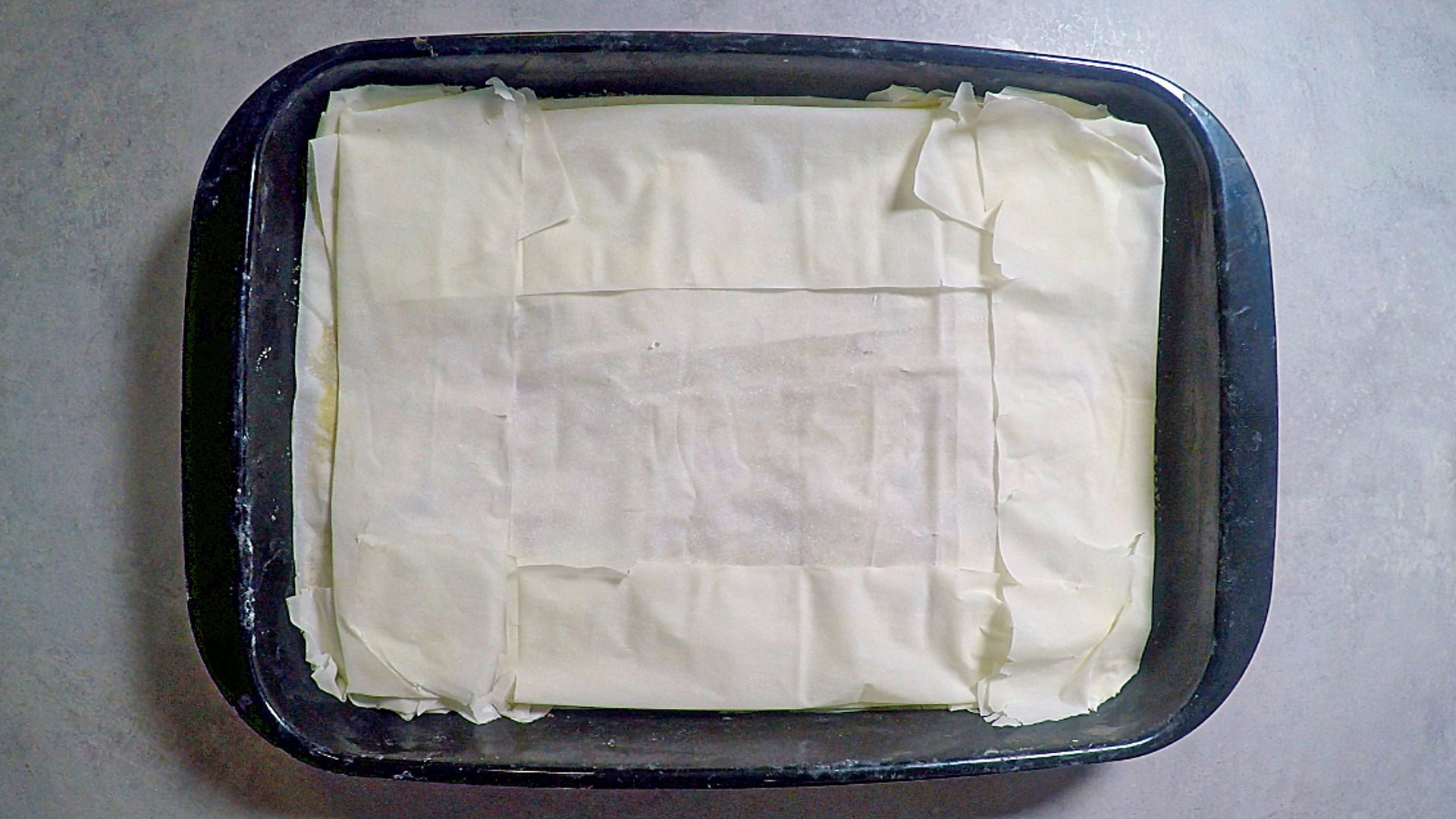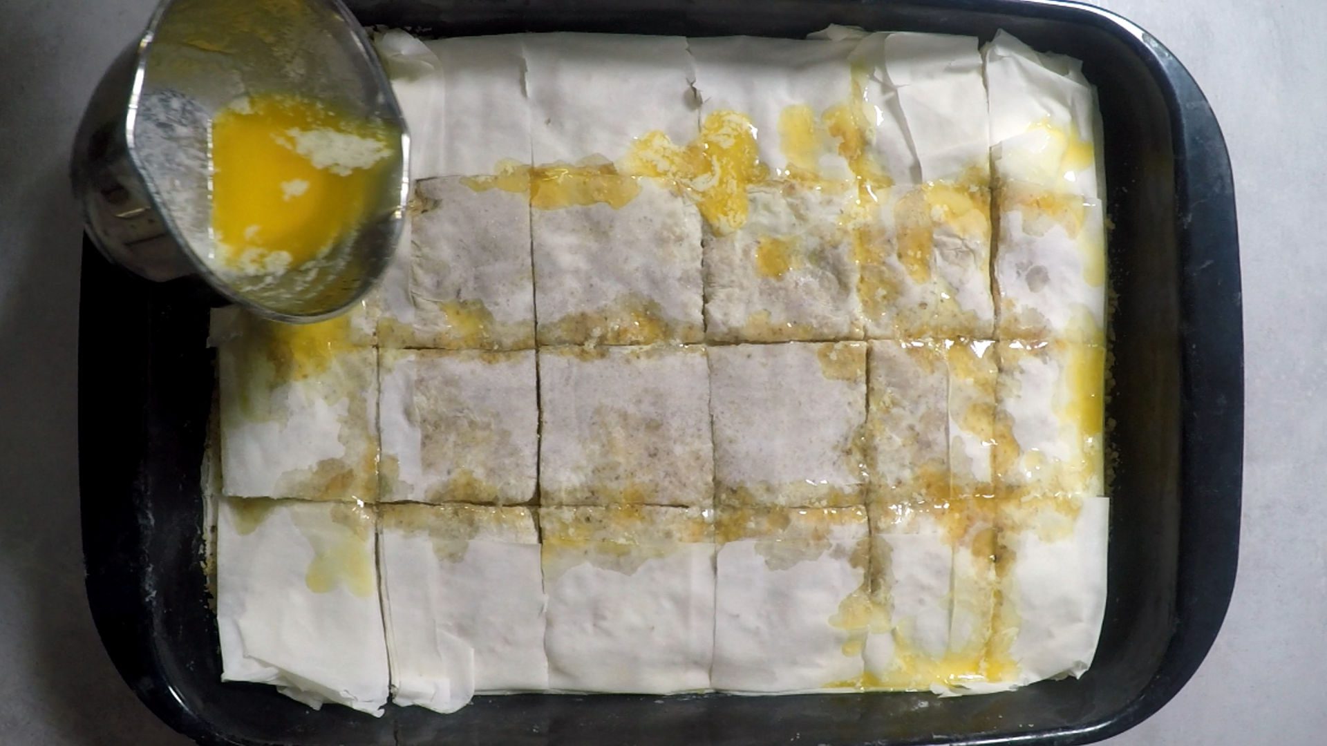 Before adding the final 2 sheets, cut the Baklava into small squares or diamonds. Press the knife firmly so the layers stick together.