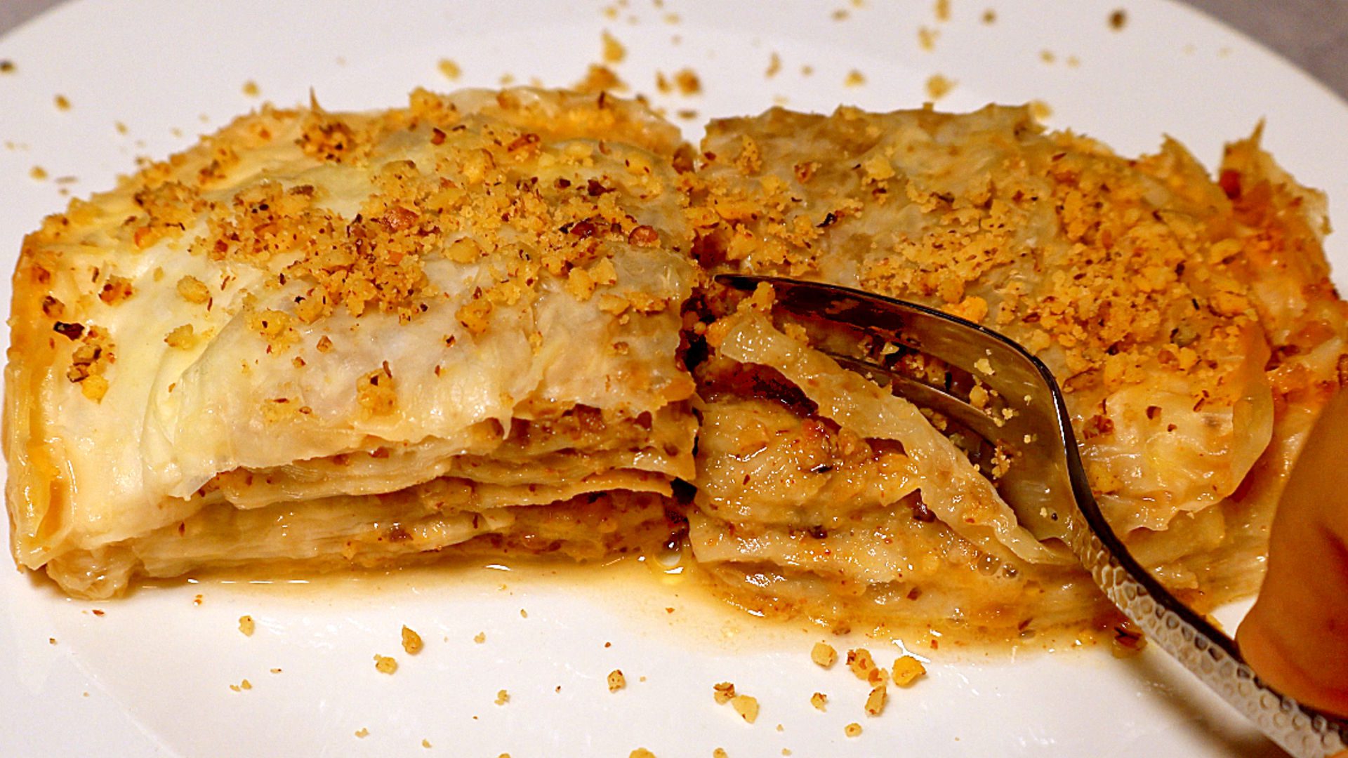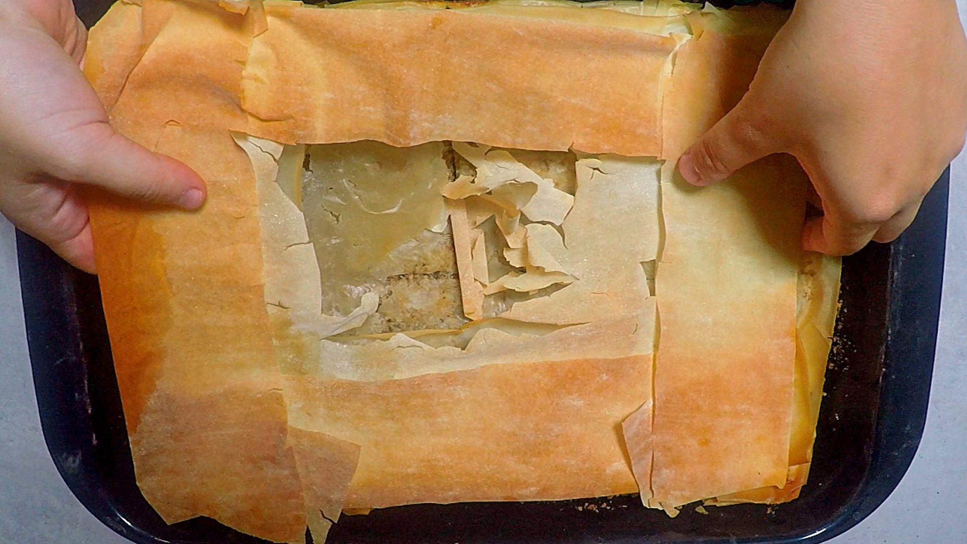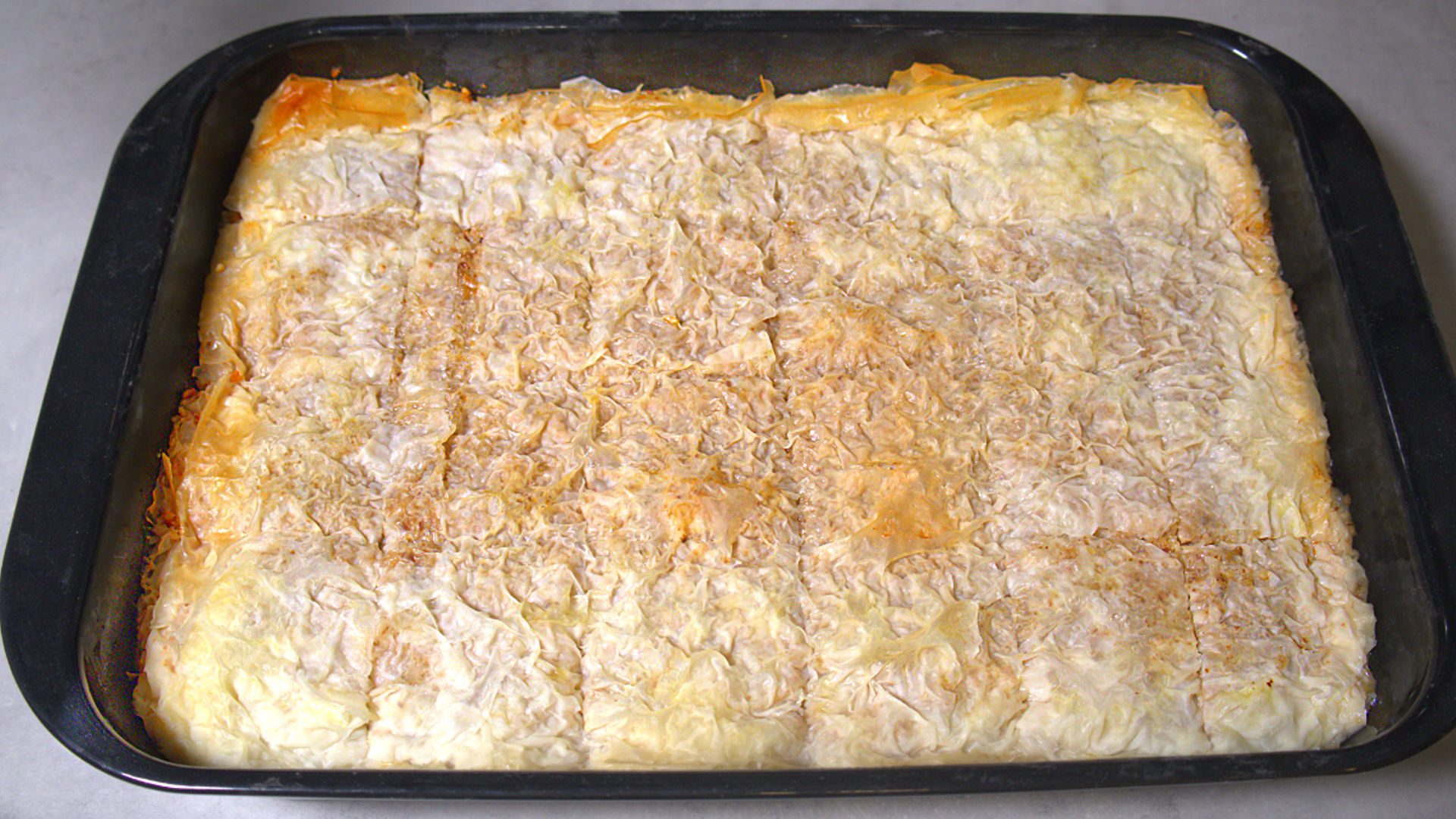 Before adding the final 2 sheets, cut the Baklava into small squares or diamonds. Press the knife firmly so the layers stick together.