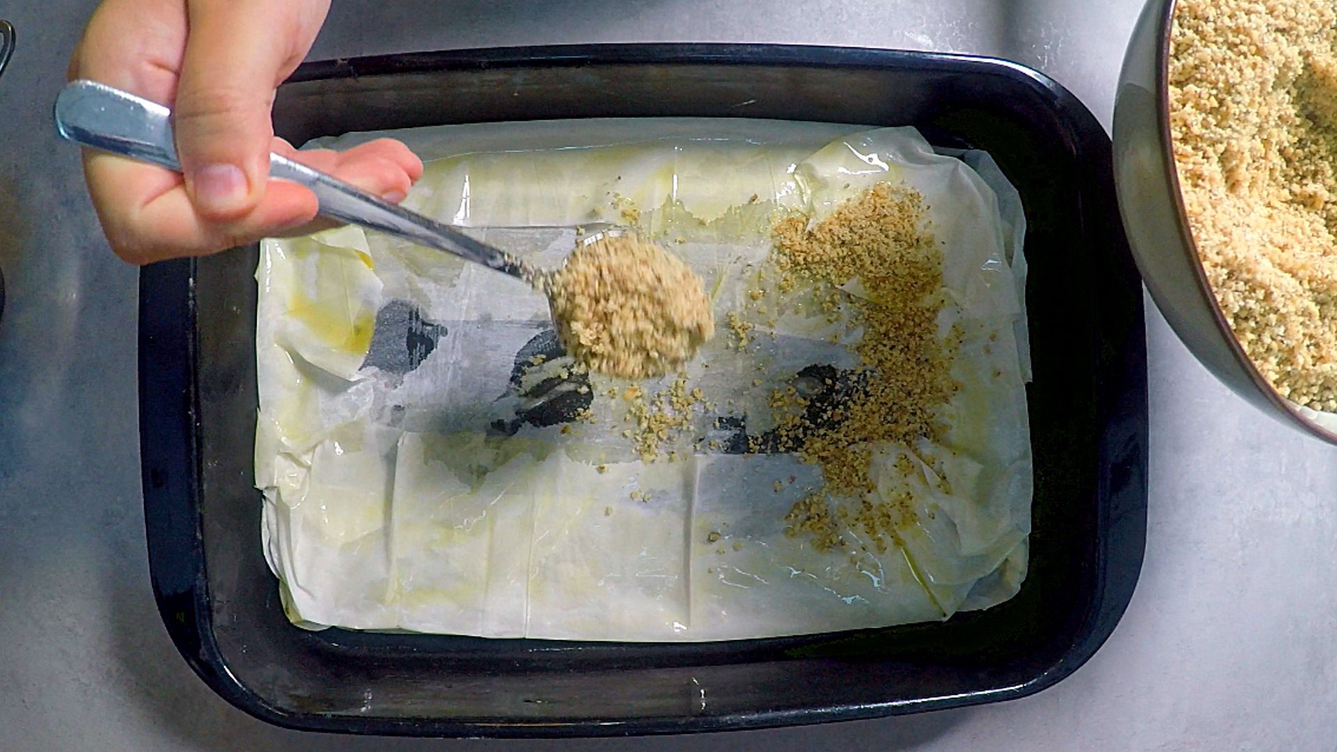 Repeat the process: 2 sheets ā Walnuts ā Butter ā 2 sheets ā Walnuts ā Butter⦠until you run out of Filling.Save the last 2 sheets to cover the Baklava at the end so it doesnāt burn.