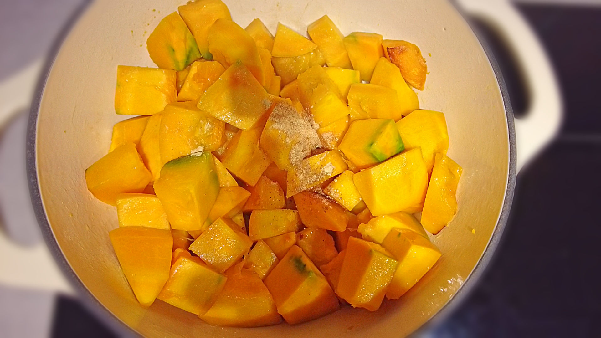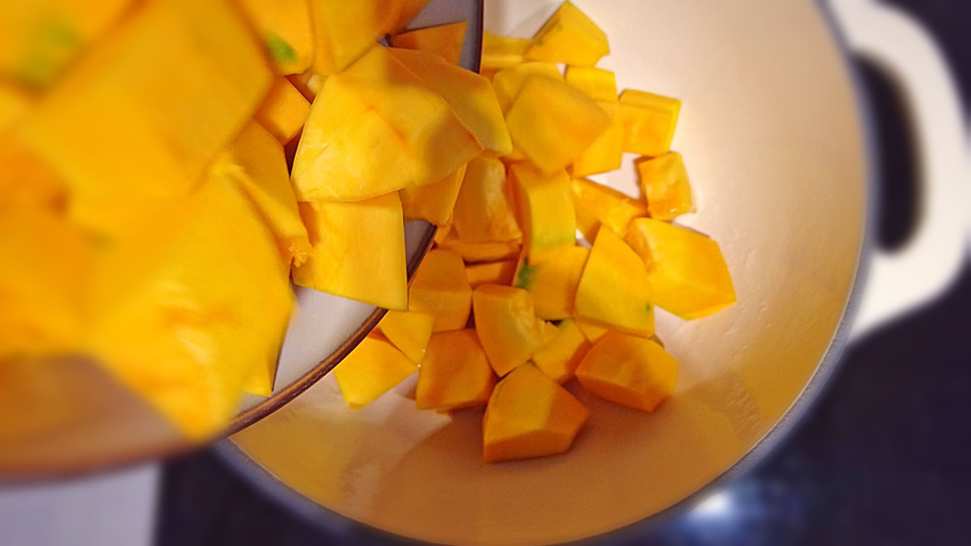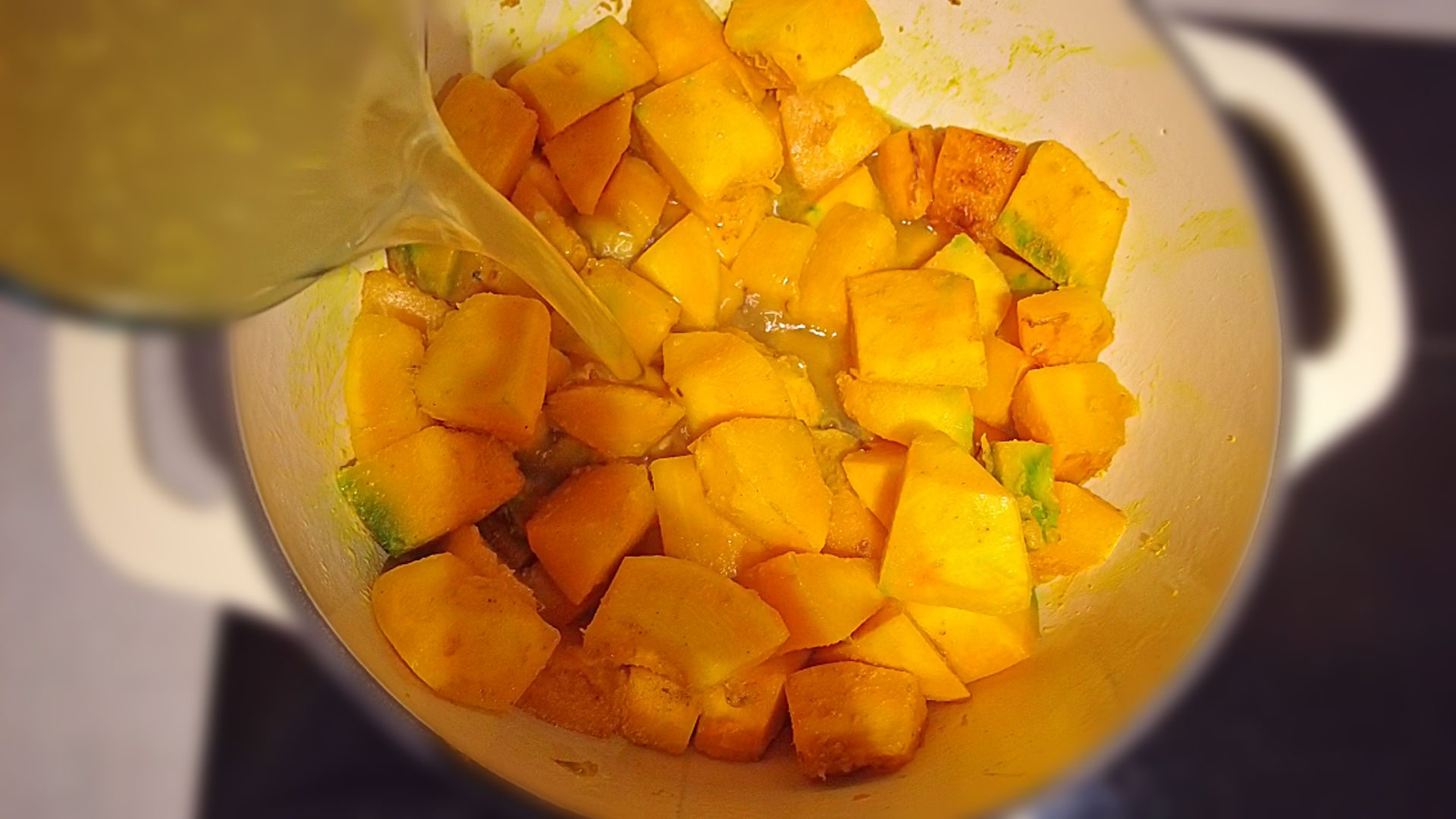 Add the Pumpkin cubes and sautƩ for 7 min on medium heat until slightly golden.