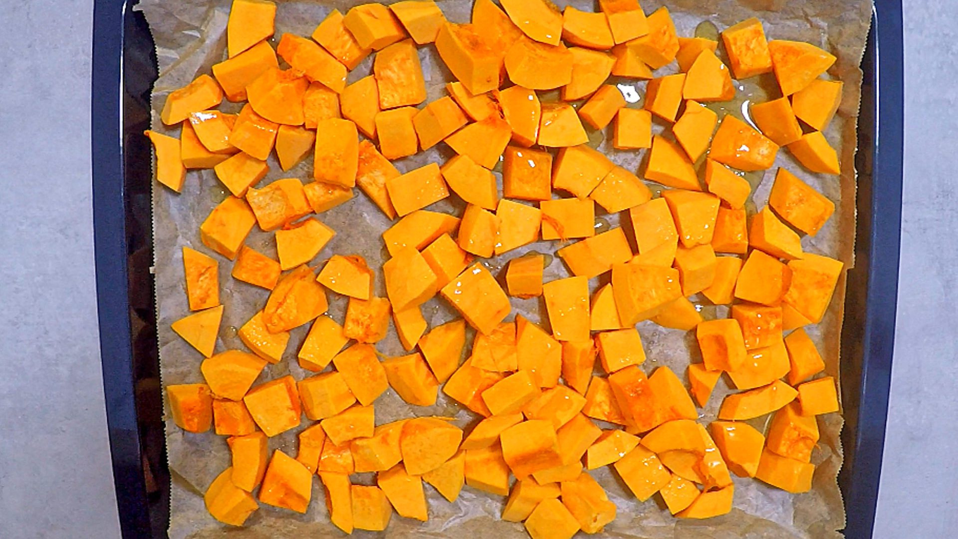 Peel the Pumpkin, remove the Seeds, and cut the Flesh into bite-sized Cubes.