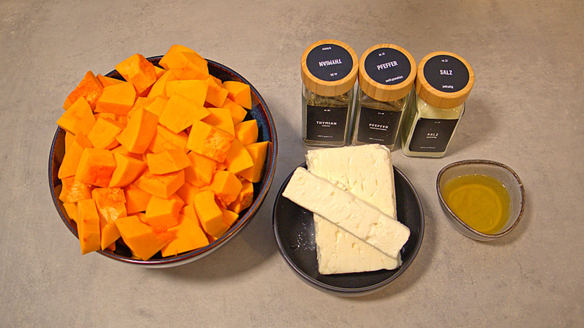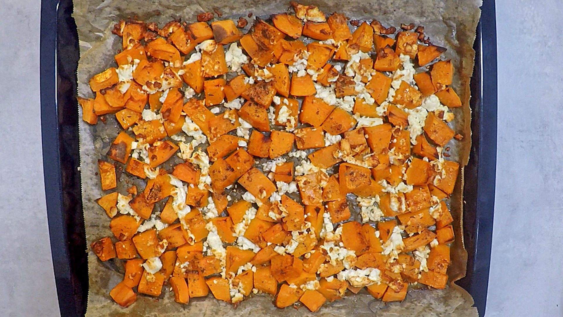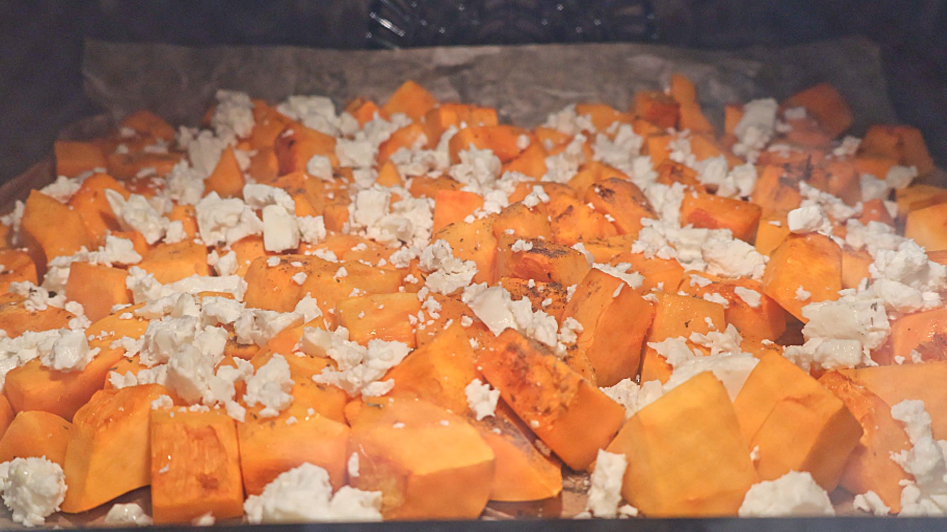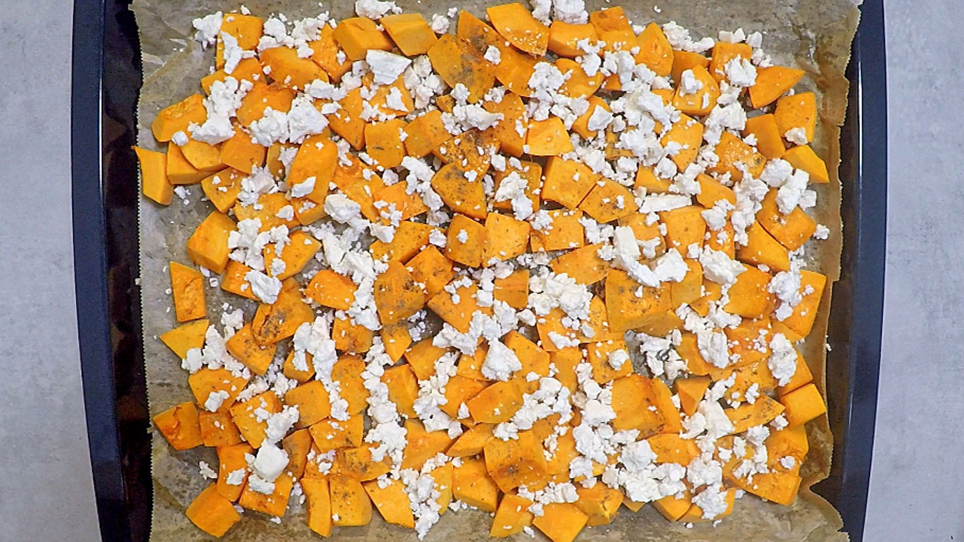 Crumble the Feta Cheese over the Pumpkin Cubes.