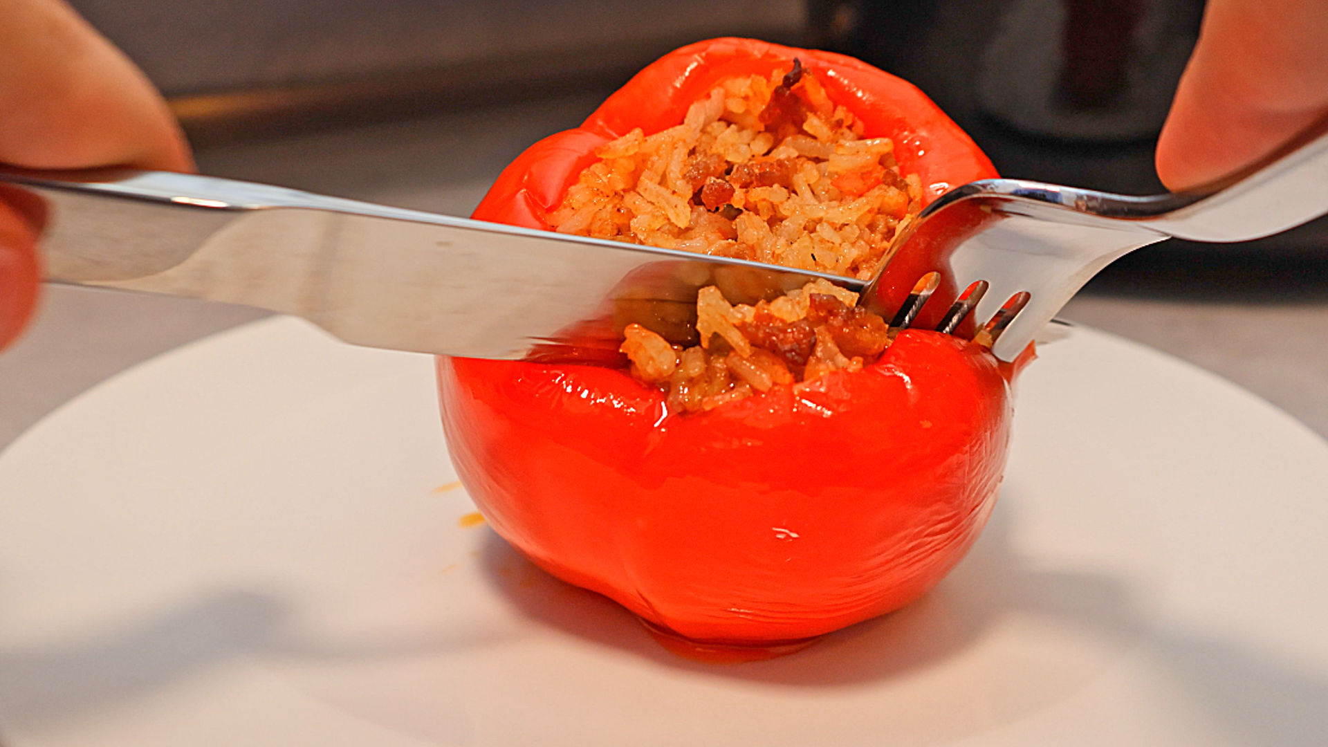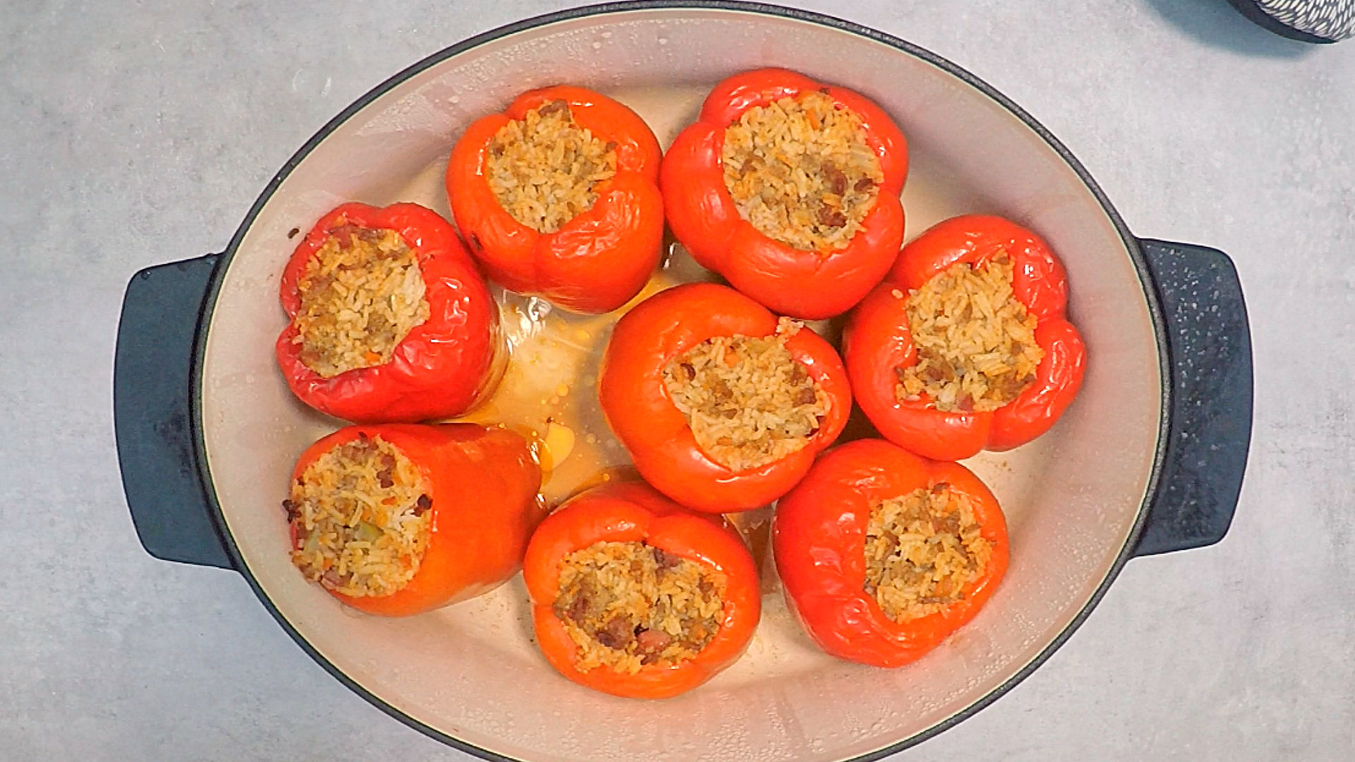 Bake at 200°C for about 70 minutes, until the Peppers are tender and slightly roasted on top.