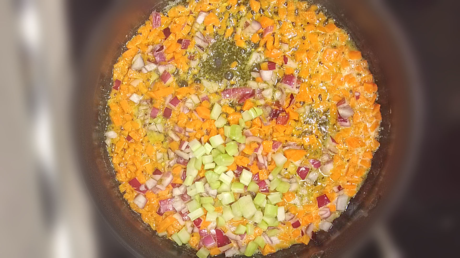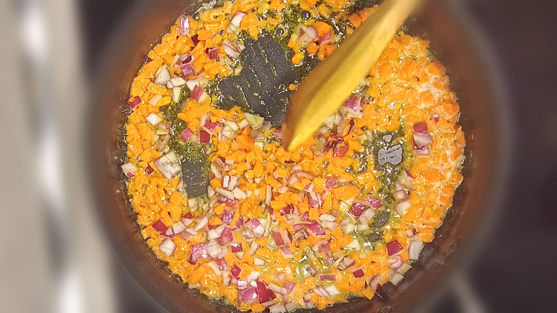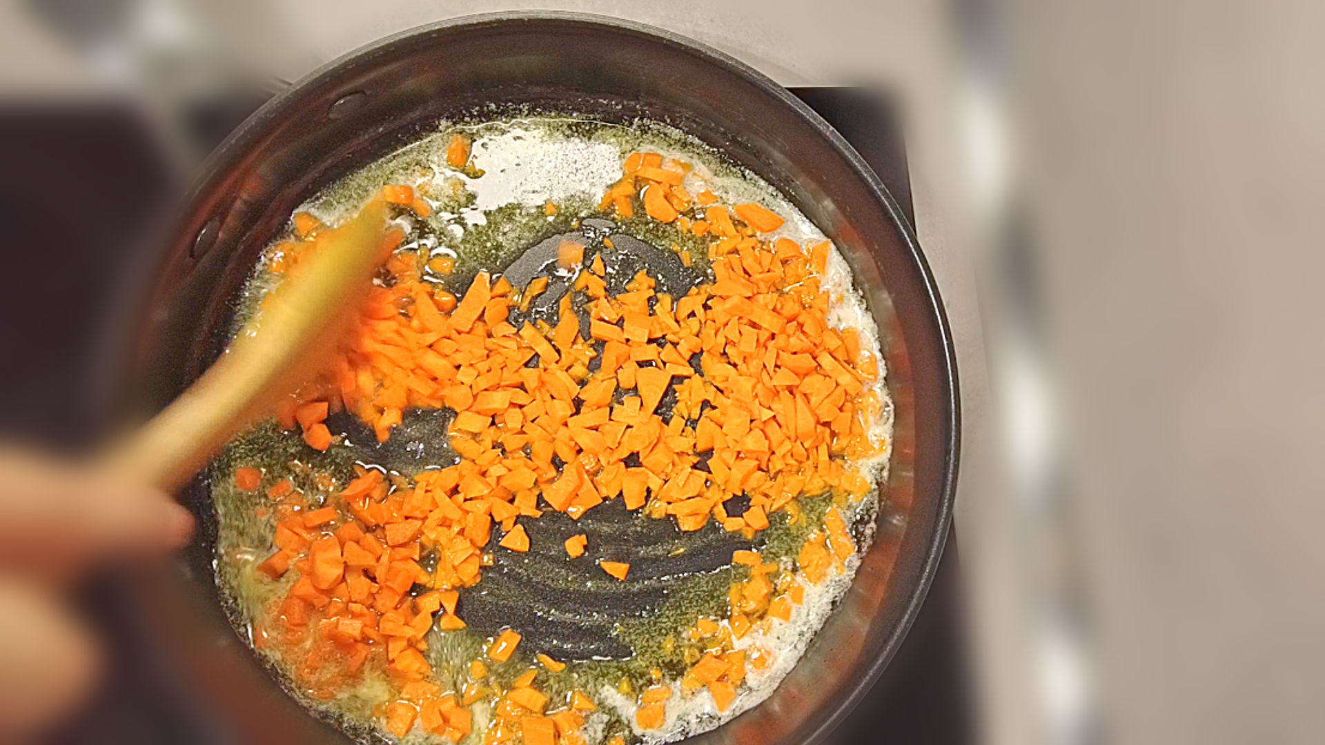 Add the chopped Carrots and a pinch of Salt, and sautƩ for about 3 minutes.