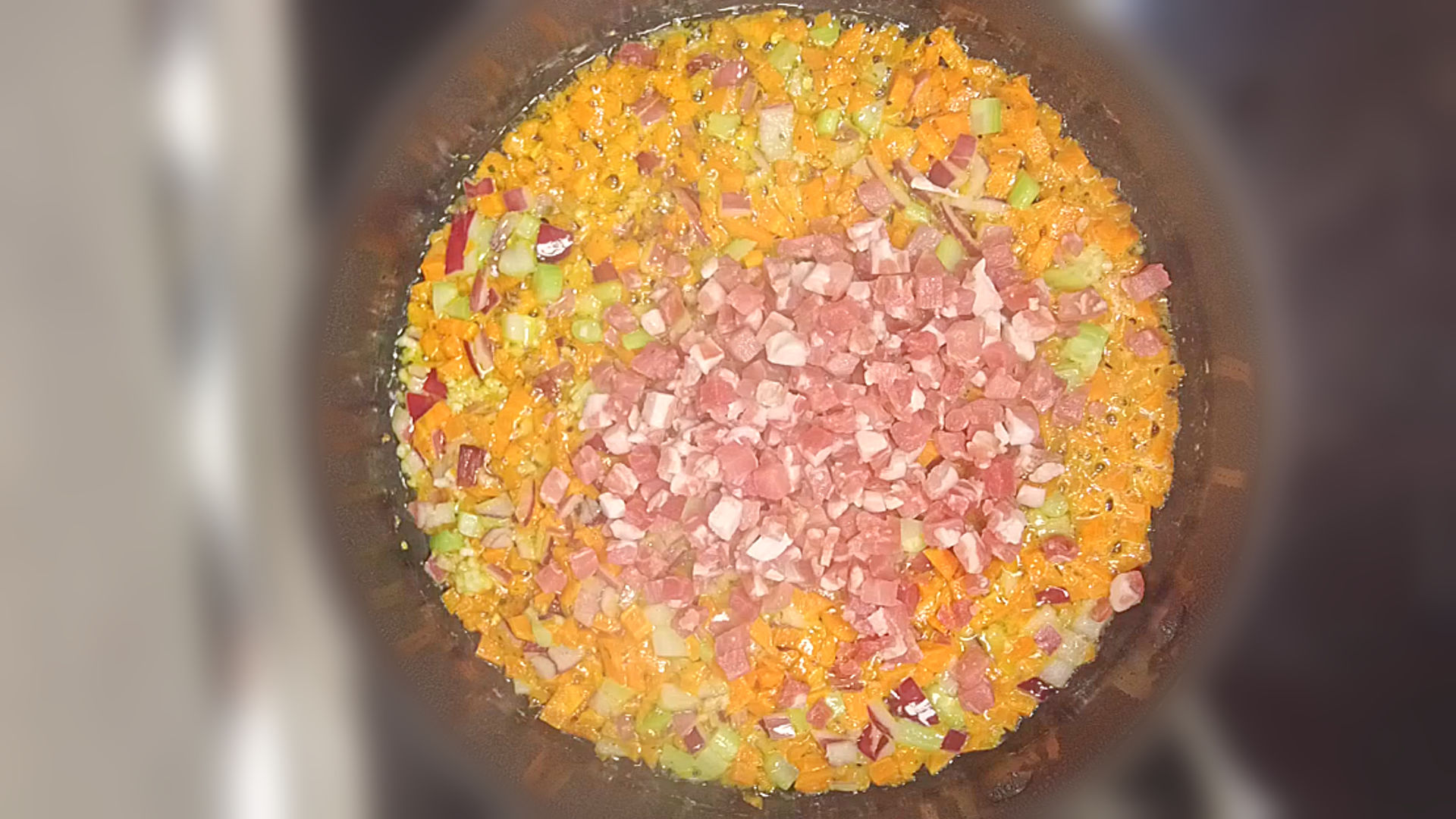 Then diced Bacon, and cook for about 5 minutes on low heat.