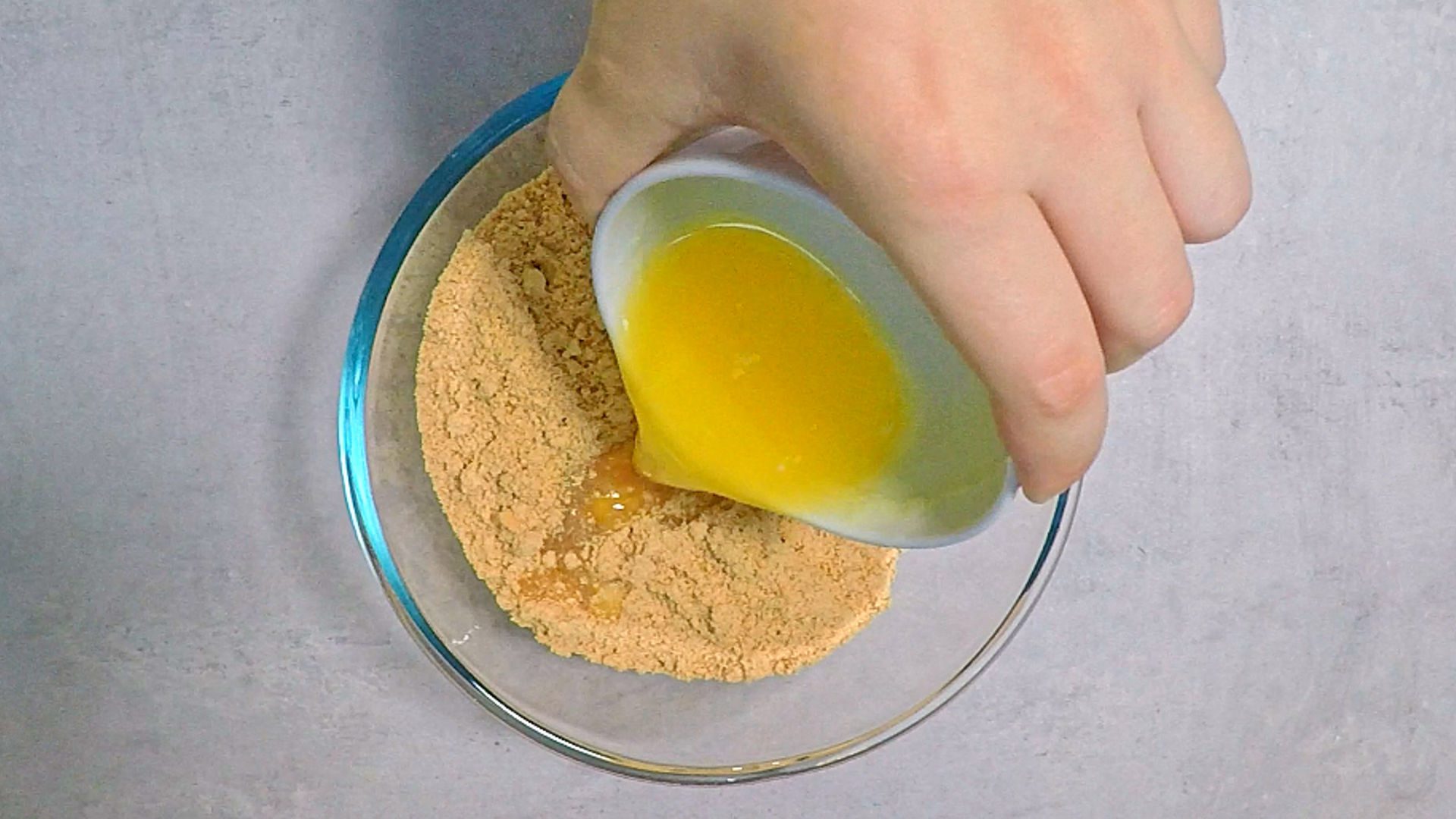 Mix the crushed Biscuits with the melted Butter until well combined.